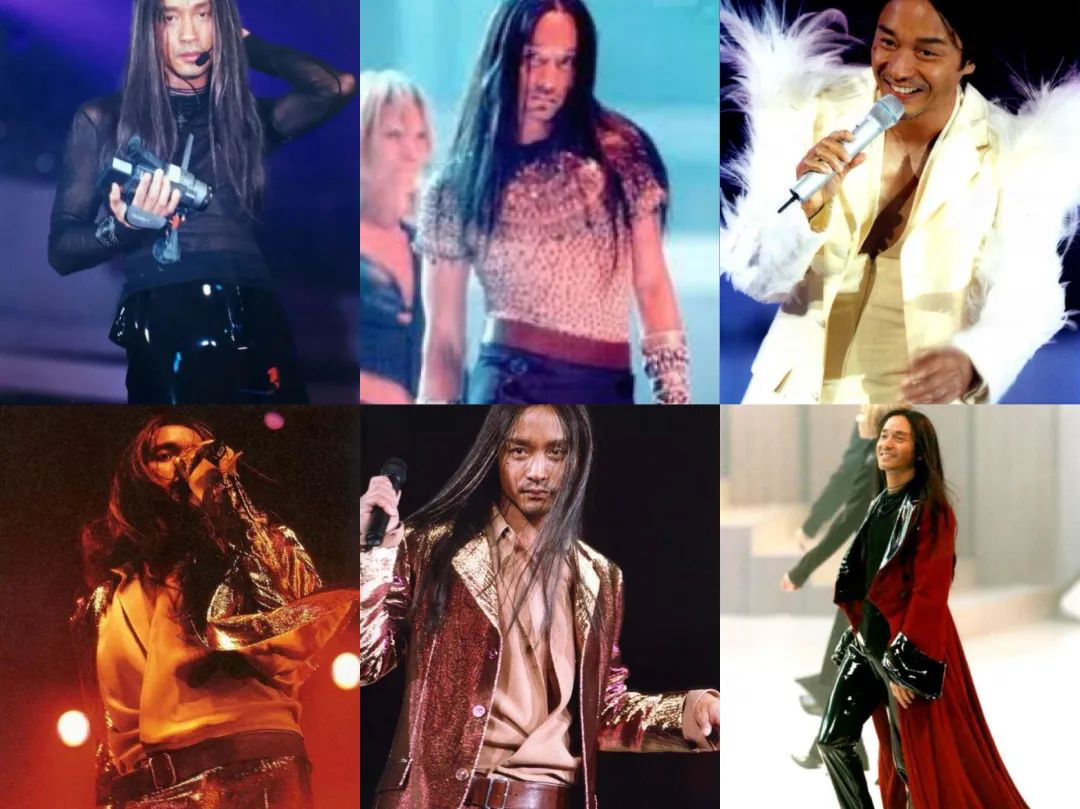 今日好Leslie的张国荣,一头夹杂着金丝的黑长发,配着深V的露背装。